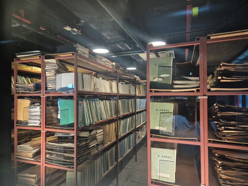 | 탄광 운영시설 기록물 - 봉급표 등 전시 | 샤워장을 전시장으로 변형한 곳 | 과거의 타자기 |