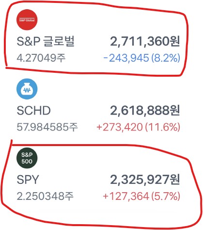 | 왼쪽은 S&P500ETF인 SPY이고 오른쪽은 S&P Global 이예요. | 저의 조금씩 모아온 두개의 차이예요. |