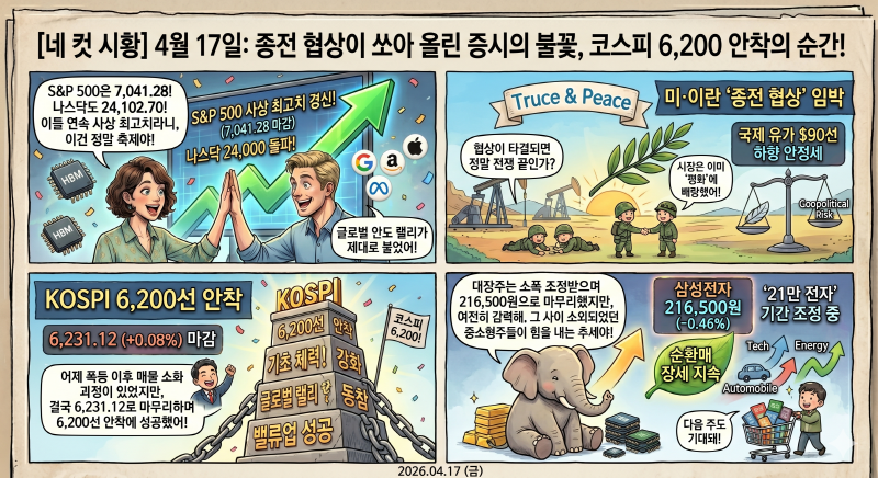 - 미·이란 종전 합의 임박: 미국과 이란의 휴전 합의가 장기적인 '종전'으로 이어질 것이라는 소식이 글로벌 증시의 불확실성을 완전히 걷어내고 있습니다.