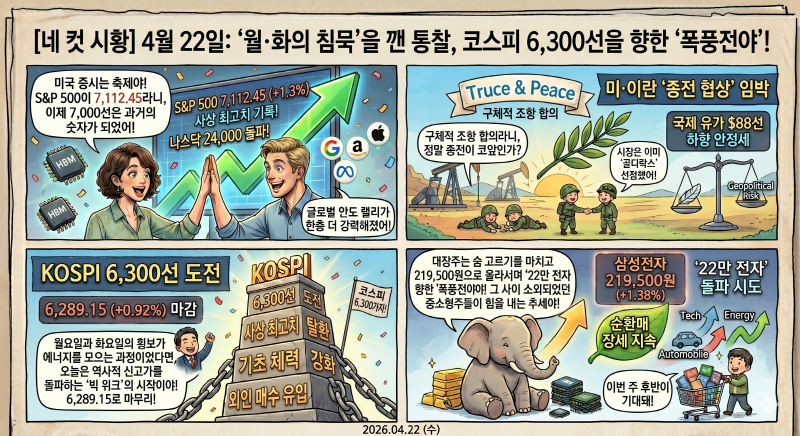 | [시황 토크] 2026년 4월 15일: 6,000 코스피가 보인다! 삼성전자 21만 원 안착과 S&P 500의 기록적 질주 (6) | 2026.04.15 |