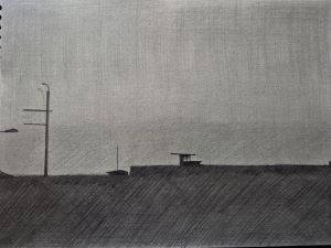 | 처음에 스케치한 건물의 실루엣이 화장지로 문지르면서 지워져서 다시 진한 실루엣을 그린다. | 진한 부분을 표현하기위해 진한 샤프심을 넣은 샤프로 가로선을 긋고 문지른다. | / 사선을 긋고 문지르고, 반대방향 사선을 긋고 문지른다. |
