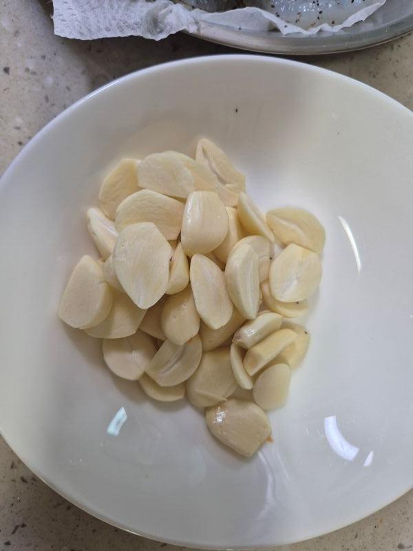 | 새우살에 물기를 제거 후 후추와 소금간하기 | 마늘 슬라이스하기 | 올리브유 데우기 |