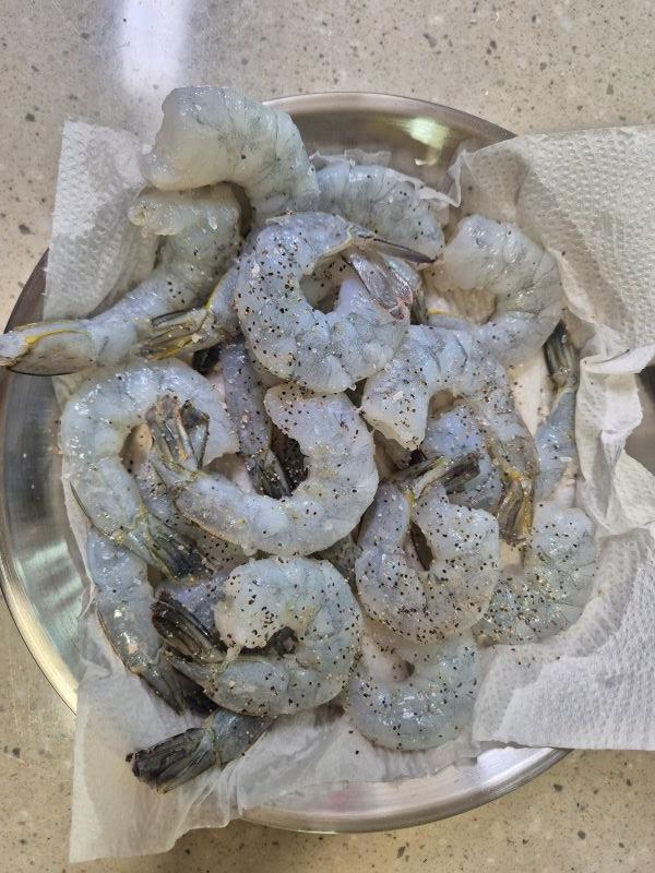 - 해동된 새우는 키친타월로 물기를 꼭 제거한 후