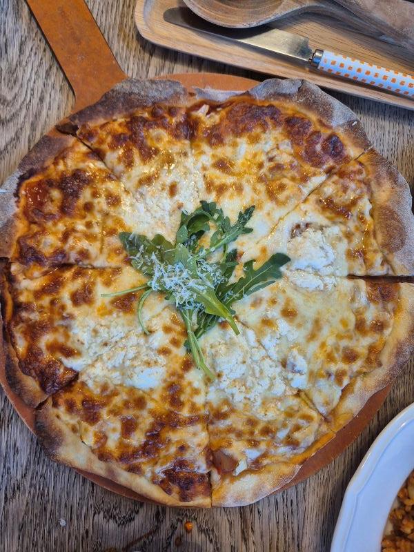 얇은 도우 위에 토마토소스와 다양한 치즈가 풍성하게 올라가 있고,