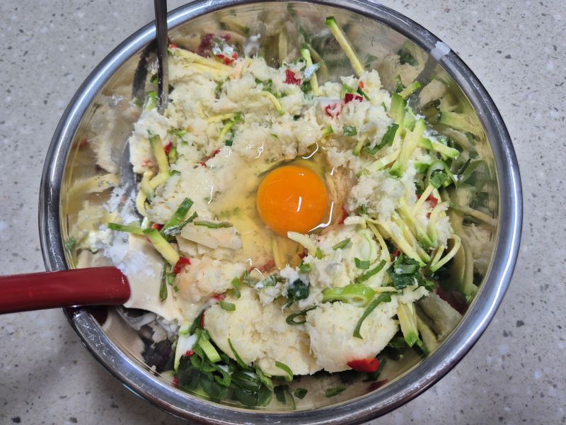 가라앉은 감자녹말 + 감자전분 가루 2큰술을 더해 쫄깃함 업! - 계란 1개, 소금 약간을 넣고 잘 섞어 반죽을 만듭니다.