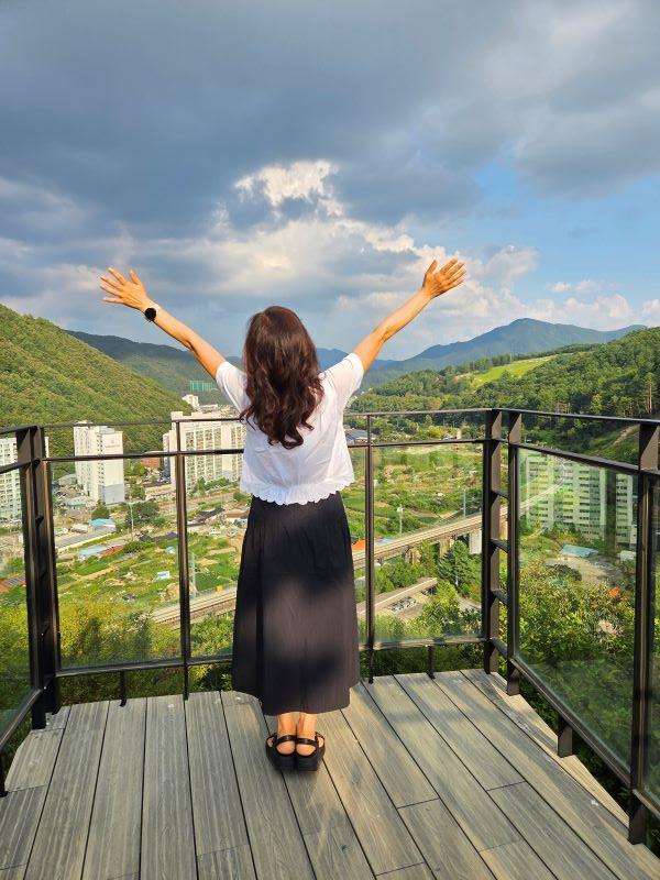 야외 테라스에 앉아 바라보는 정선의 산들바람 속에서