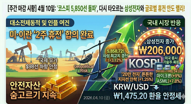 [주간 마감 시황] 2026년 4월 10일: '코스피 5,850선 돌파', 다시 타오르는 삼성전자와 글로벌 휴전 안도 랠리