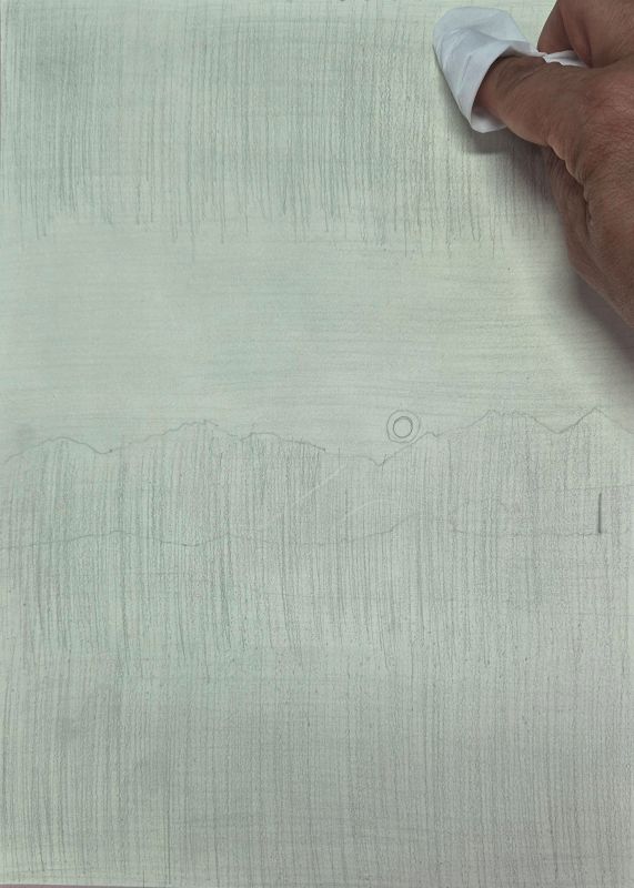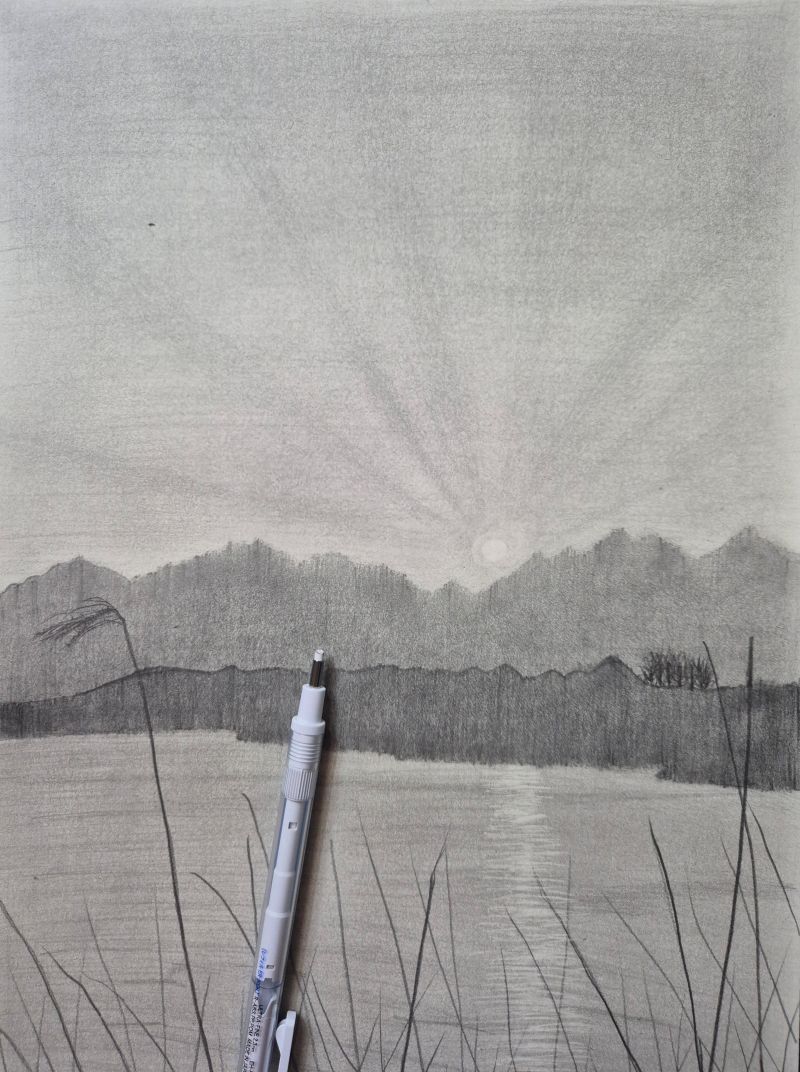 | 산의 실루엣을 진하게 선긋기 | 아래 호수의 경계부분도 진하게 선긋고 문지르기 | 더 가까이 있는 산은 더 진하게 한번 더 선긋기 후 문지르기 |