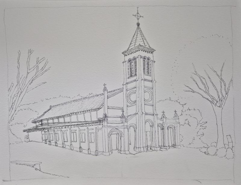 연필로 성당 건물의 큰 윤곽과 양옆 나무, 배경의 산을 배치합니다. - 드로잉펜으로 선 그리기